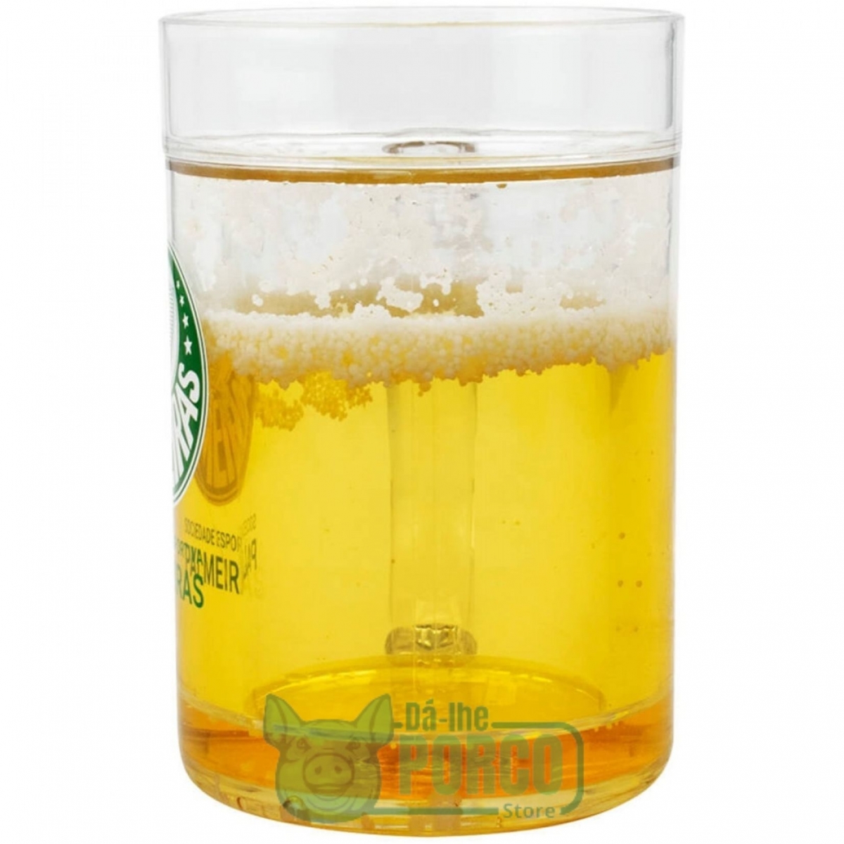 Caneca de 200 ml de capacidade revestido com gel isolante térmico com aparência de cerveja. Ao colocar no freezer o gel congela e a bebida pode ser tomada muito mais gelada. Copo gravado com escudo do Palmeiras. Material: plástico